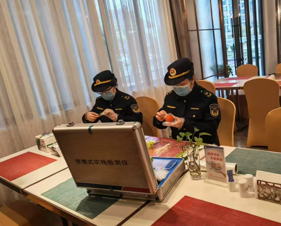 会议期间,入驻各欢迎单元全程监视。索证索票、加工操做规范、同时操纵快速检测设备,对蔬菜农残、肉类水分及餐饮具干净度等目标开展示场筛查快速检测,检测成果全数及格。